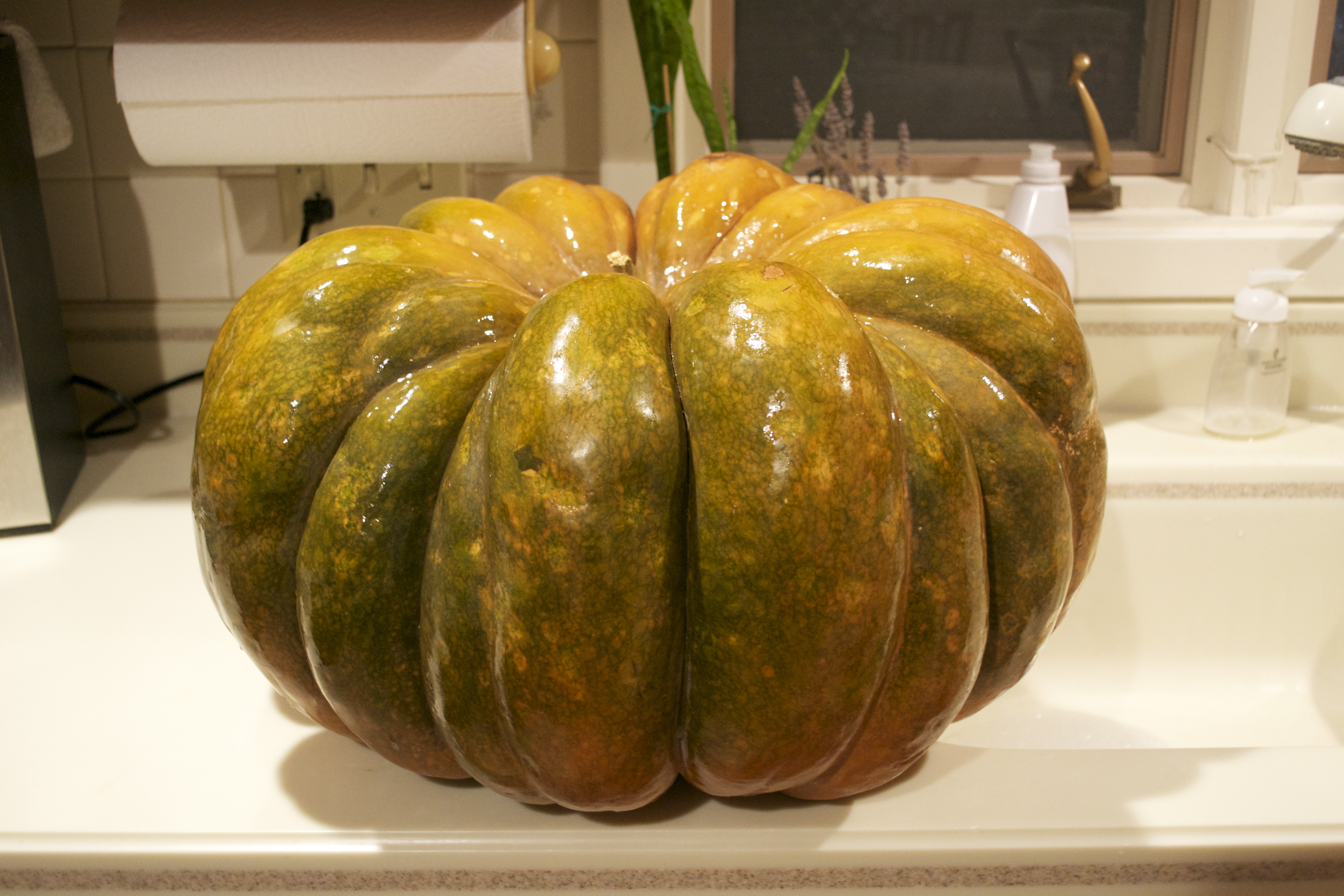 One of the first things Stephen’s father had to point out to me when I arrived in Kutztown… a very very large pumpkin they had sitting on their front stoop. Apparently it’s called a Cinderella Pumpkin. On the outside, it was a lovely green with pale orange (my pictures don’t do it justice). I believe it weighed somewhere around 60 pounds… and would therefore produce enough pumpkin for everyone in Kutztown to have some pumpkin pie for Thanksgiving.