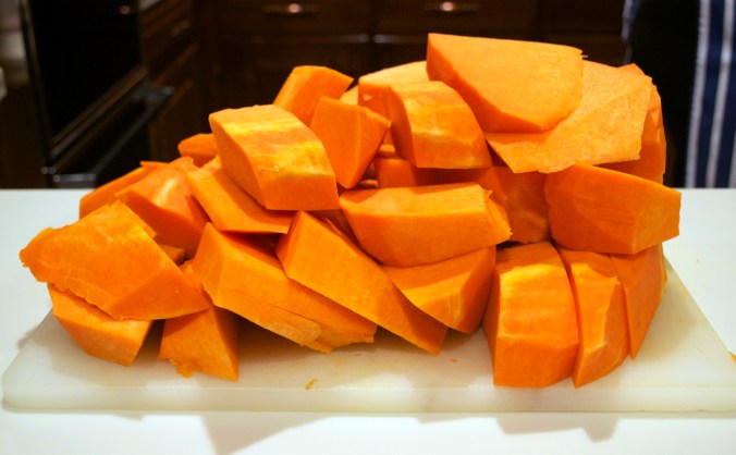Stephen’s mom spent all of Tuesday night cutting the pumpkin into giant viking ship shaped wedges and then into large chunks to broil & steam and then puree. She really labored over this pumpkin in a very impressive way. Seeing as she had too much pumpkin for her to feasibly use in the next couple of yeeears she sent me home packing with two large bags of raw pumpkin squares and one large bag of puree. I was more than happy to take some extra pumpkin off her hands. I have plenty of ideas for delectable looking pumpkin dishes I want to make over the duration of the holiday season.