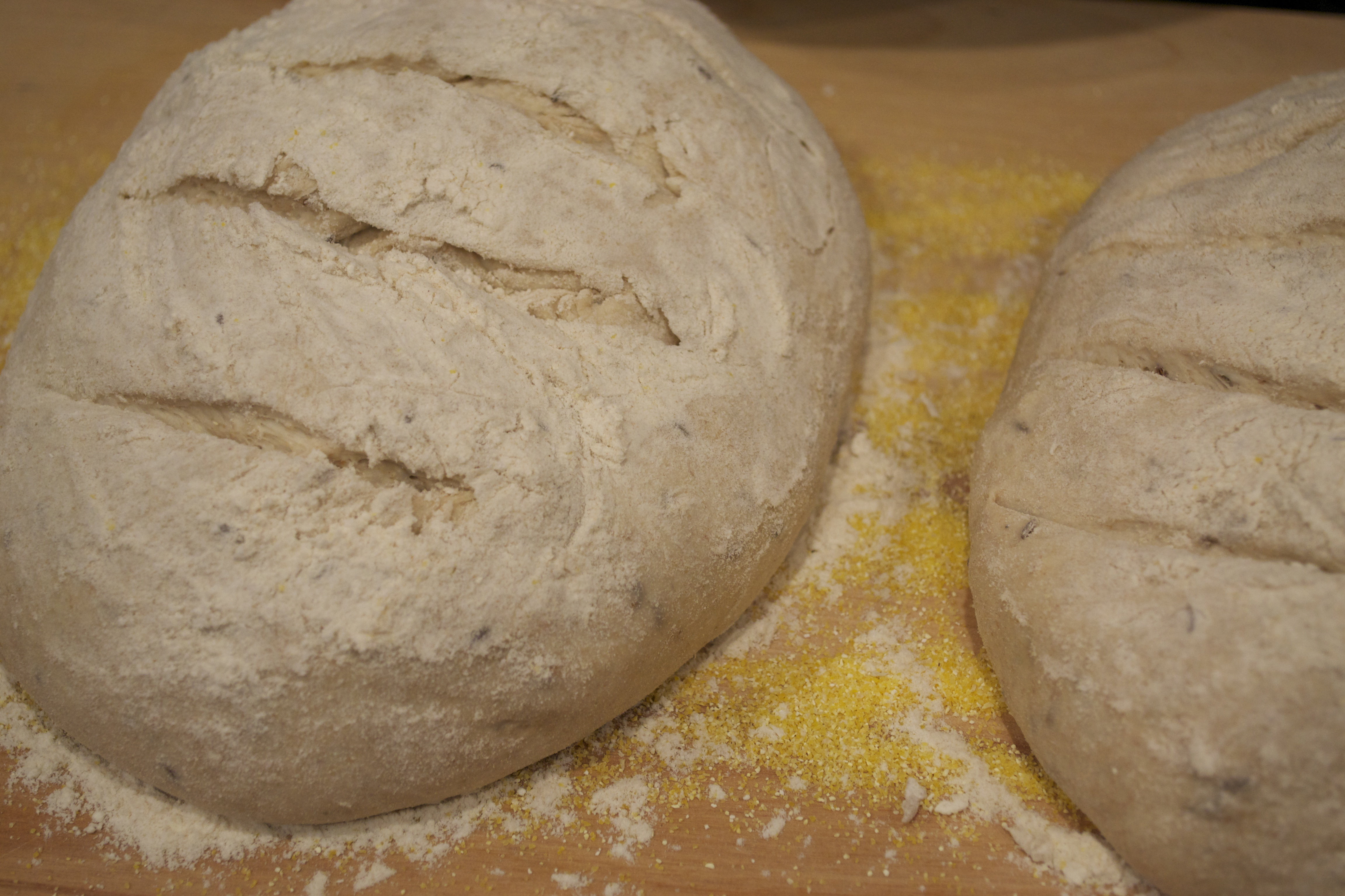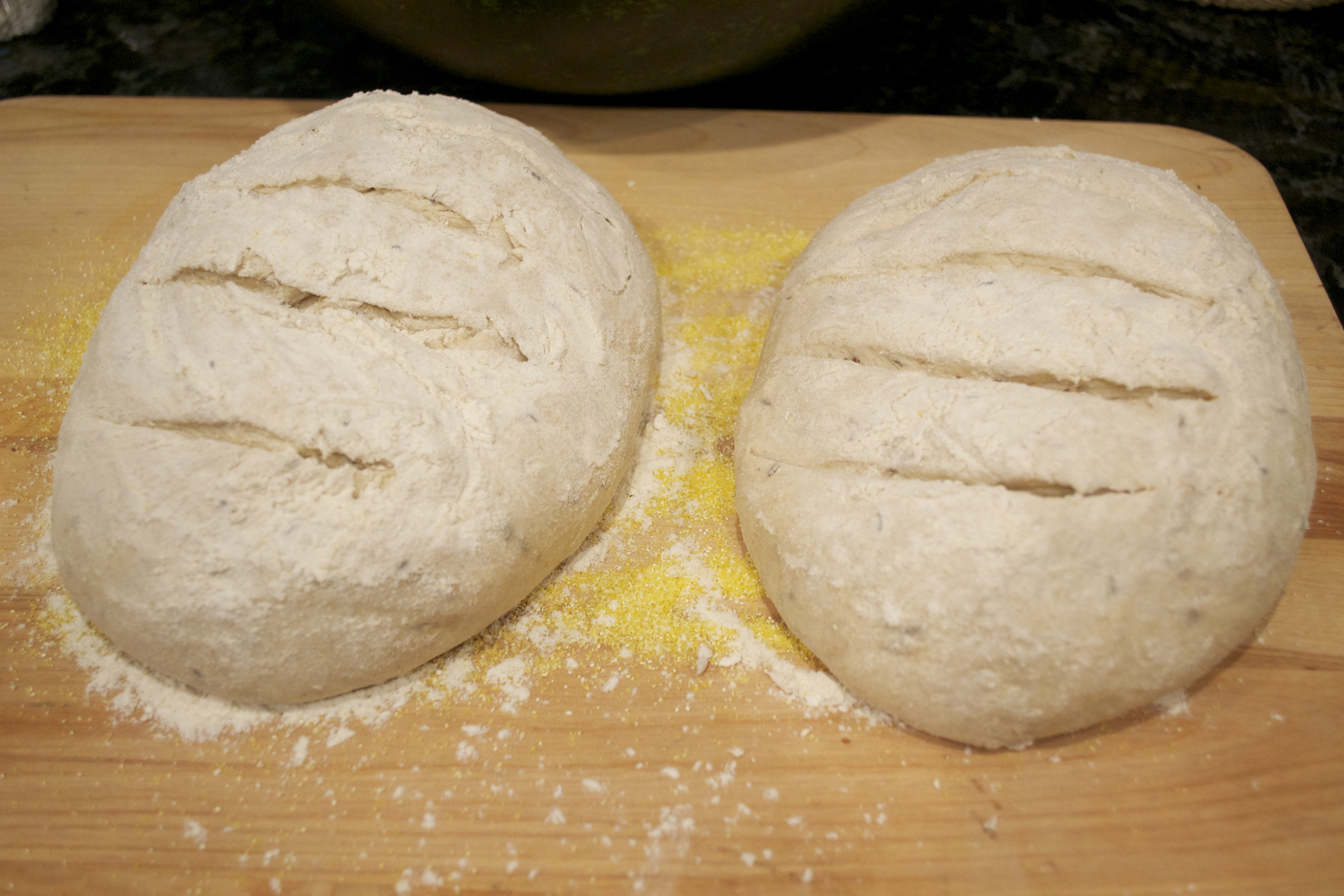When the dough has finished rising, preheat your oven to 450F degrees. Place a pizza stone in the oven on a center rack and allow it to reach oven’s temperature. Cover a pizza peel with cornmeal. If you don’t have a pizza peel, like me, a large wooden cutting board will do the trick. Divide the dough into the desired number of loaves and shape into oval by pulling the top of the dough towards the bottom of the loaf while turning it and elongated the loaf when you’ve accomplished a smooth top. Don’t worry about the bottom not being smooth, it will cook into a nice flat, crunchy crust. Let the loaves sit on the prepared pizza peel/cutting board for about 40 minutes before baking. Cover each loaf with about 1tbsp of flour and spread with your hand. Make 5 slashes across the top with a serrated knife.