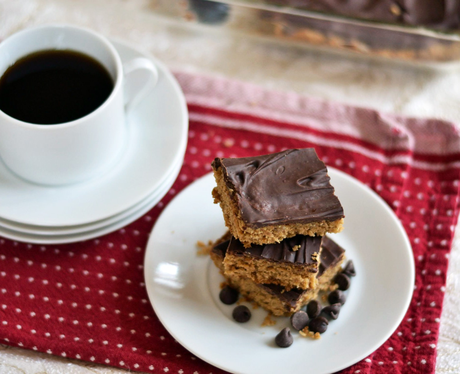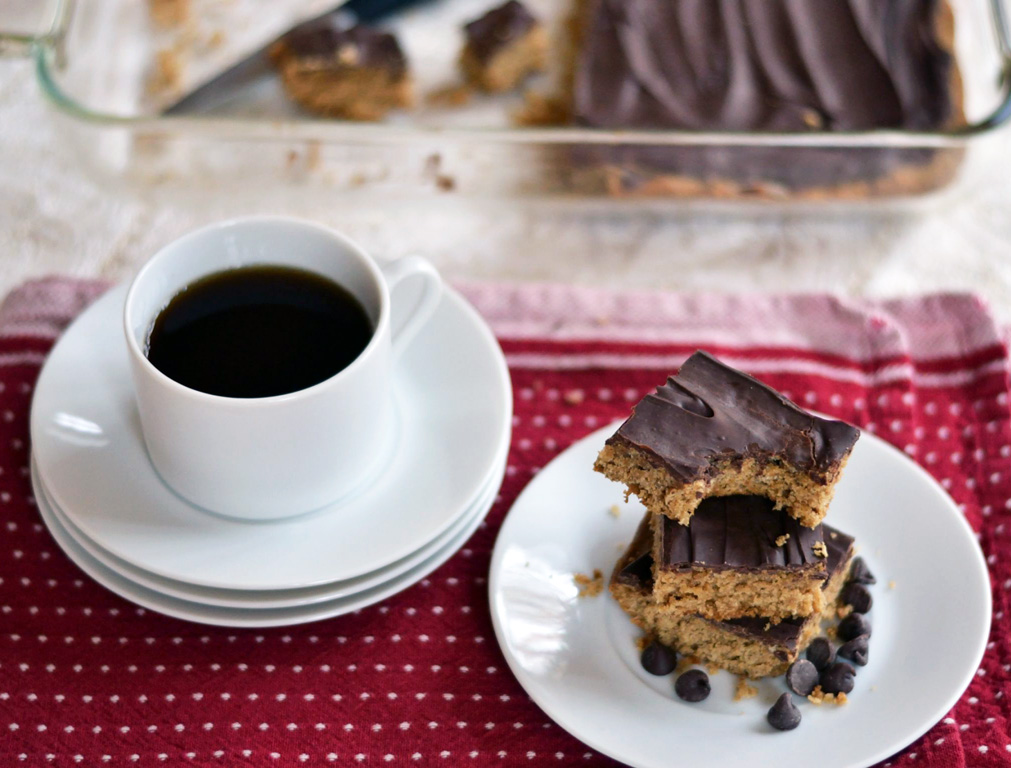 It’s easy to eat 1/2 a pan because they’re not too sweet, just sweet enough, and almost fool you into thinking they might be healthy.ish. And the flavors of peanut butter & chocolate flood your mouth as your teeth sink into the soft, chewy bars.