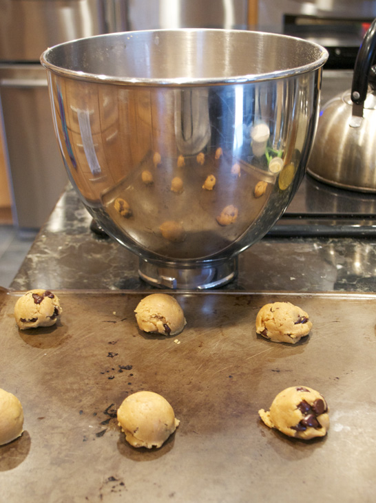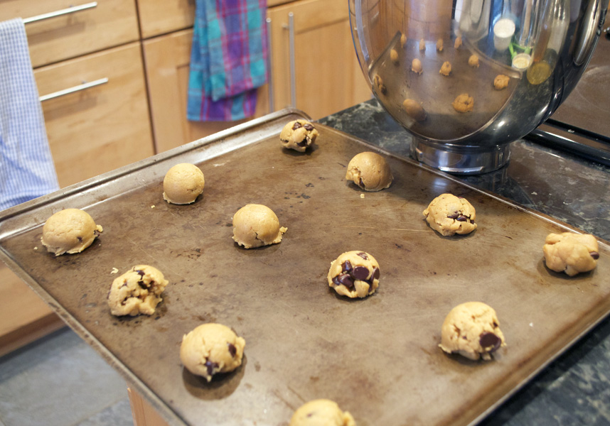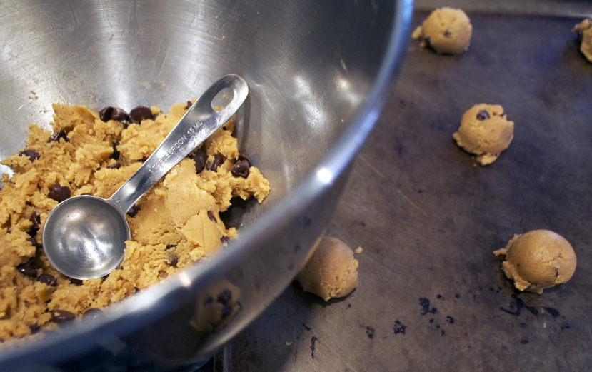 Add flour, oats, baking soda & salt – slowly. Beat until well-mixed & smooth.